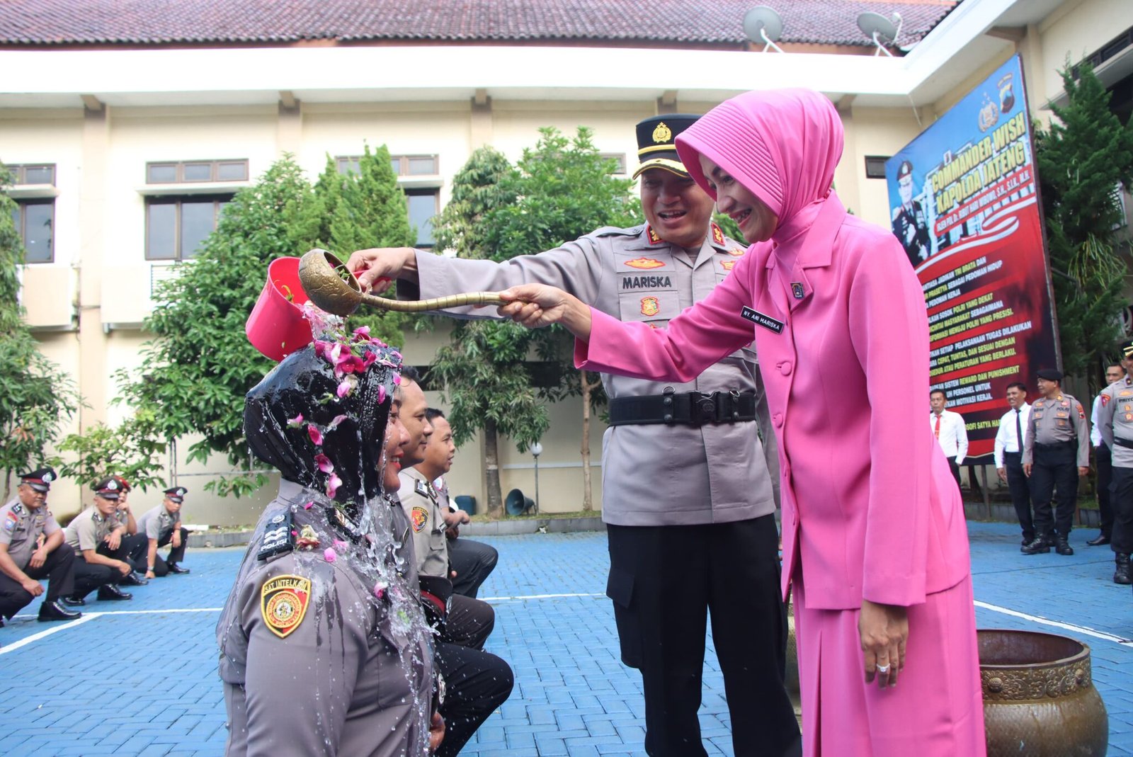 Setelah upacara selesai, seluruh jajaran memberikan ucapan selamat kepada para anggota yang baru saja naik pangkat. Tradisi penyiraman air bunga pun dilakukan sebagai bentuk simbolis penyucian diri dalam menyambut tanggung jawab baru yang lebih besar.