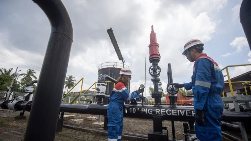 PERIKSA PIPA: Pekerja memeriksa pipa minyak booster station 27 milik PT Pertamina Gas Operation Central Sumatera Area (OCSA), Banyuasin, Sumatera Selatan, Jumat (19/9). PT Pertamina Gas Operation Central Sumatera Area (OCSA) melalui Distrik Palembang mengoperasikan Booster Station KM 27 yang berfungsi menjaga kelancaran operasional sekaligus kehandalan penyaluran minyak mentah. (Foto: Ist)